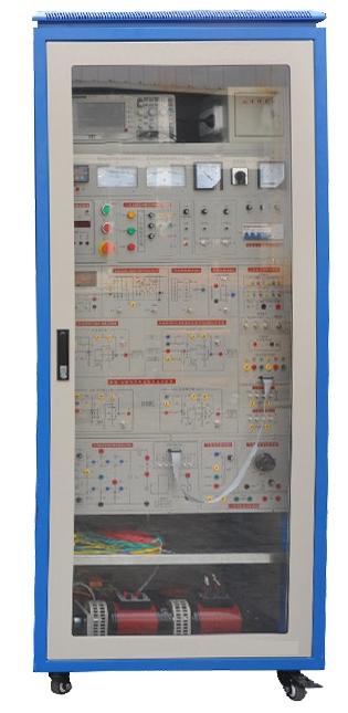 控制柜最上部為示波器放置區(qū)和設(shè)故箱,中間部分為電源控制部分,實(shí)訓(xùn)接線區(qū)和相應(yīng)的監(jiān)控儀表,裝有±300V直流電壓表、±2.0A直流電流表和數(shù)字轉(zhuǎn)速表用于指示直流電機(jī)的運(yùn)行狀態(tài),控制柜下部裝有三相同步變壓器、三相電流互感器和功率晶閘管模塊等。