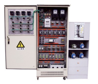 該裝置按標準電氣控制柜設計制造規(guī)格,充分利用雙面位置,柜內(nèi)裝有完成各種照明電路所需的單相電度表、日光燈、單聯(lián)開關、插座、感應開關、漏電開關等,以及電氣控制所需要的多種低壓電器,如漏電斷路器、熔斷器、電流互感器、交流接觸器、時間繼電器、熱繼電器、中間繼電器、行程開關、按鈕、信號燈、轉(zhuǎn)換開關、電壓表、電流表、功率表及電度表等,為了延長電器使用壽命,各電器的接點都與接線端子相連,再由接線端子與被控制電氣連接。