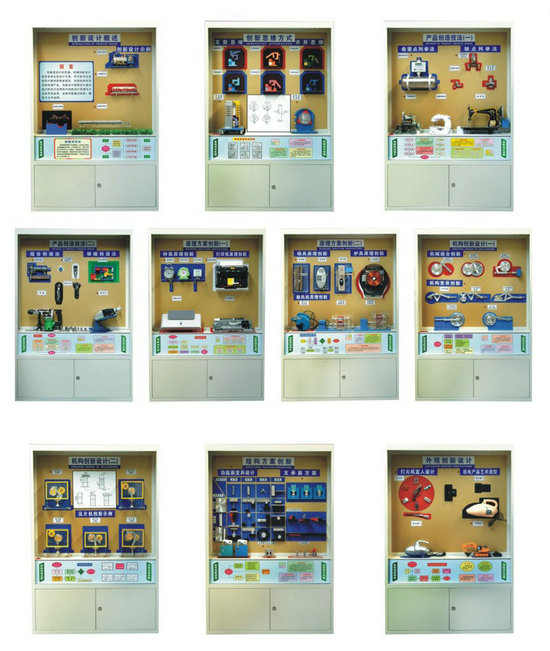 (1)、 陳列柜中的每個模型都配備了指示燈和創(chuàng)新原理分析及設計過程文字說明。