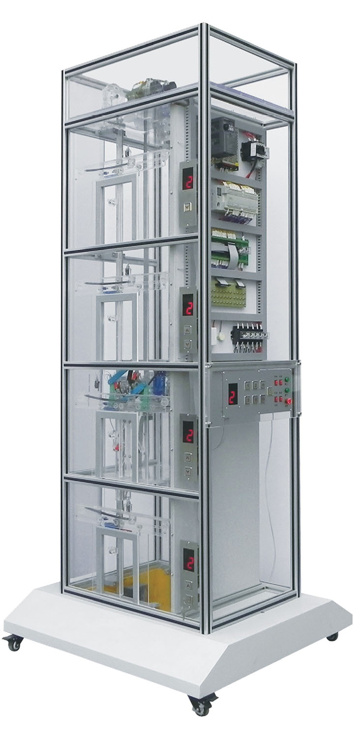 1、由兩臺四層透明仿真教學(xué)客梯組成,由層外兩處按鈕共同控制。