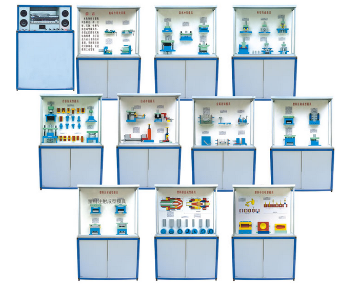 本公司力求實用根據學校教學要求需要、特制一套《冷沖壓與塑料成型工藝及模具設計》與《塑料成型模具》等教材設計而成的模具示教陳列柜,這套陳列柜共分十個柜, 具有多功能語音播放控制系統(tǒng)??捎蛇b控控制順序自動講解,又能根據教材、教學需要而遙控任意選擇講解。柜體采用鋁木結構,堅固美觀可靠,柜內模型材料采用工程塑料制作,板面附有必要文字說明,演示形象逼真,制作工藝美觀,使用本陳列柜提高教學效果,是一套現代化模具設計課程應用陳列室設備。