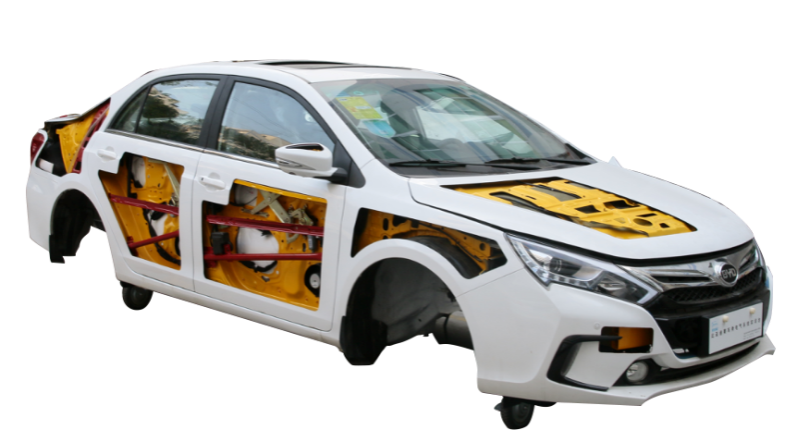 選用原裝 比亞迪秦混合動力 原車車身和低壓控制實物系統,完整的車身進行部切處理(外露電器部件),剖面位置合理,能清楚展示內部結構。