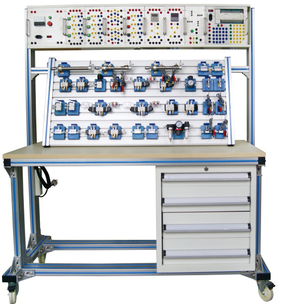實(shí)驗(yàn)臺由實(shí)驗(yàn)臺架、工作泵站、常用氣動(dòng)元件、電氣控制單元等幾部分組成。